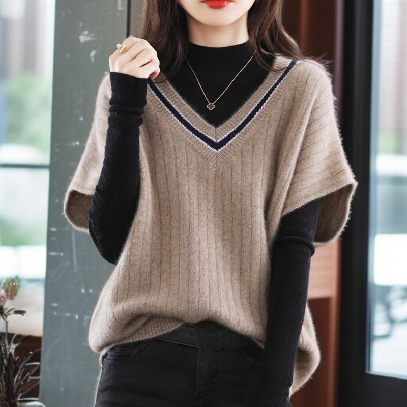 ニットの底の外にゆるいセーターの馬甲女性vネックの肩のセーターの外にゆるい馬甲がついている